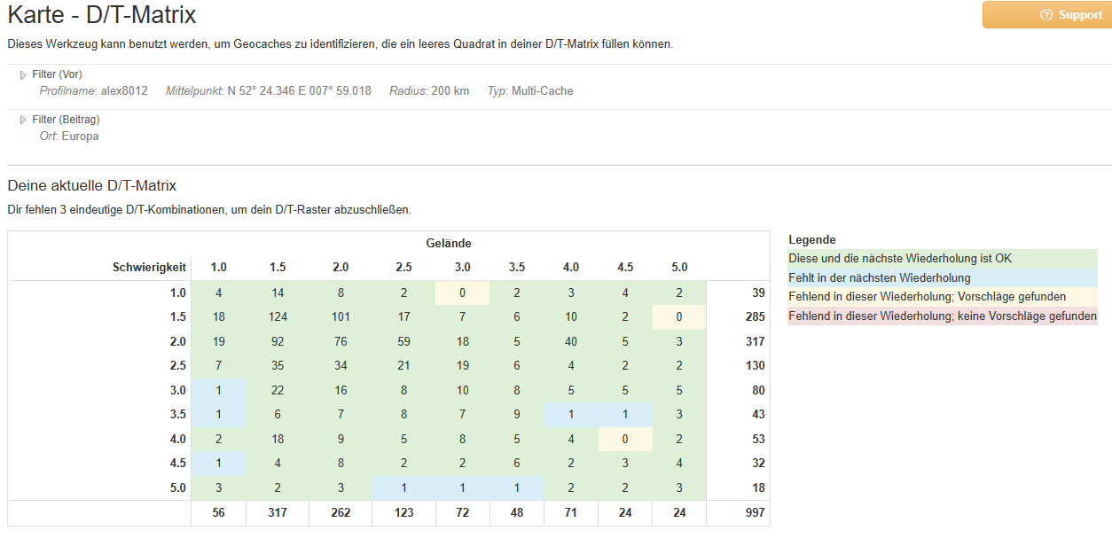 Laut Checker fehlen mir noch 2 Wertungen. Nach dem DT-Matrix-Tool angeblich 3. Interessant ist auch das die Zeilen- und Spaltensummen unterschiedlich sind. Ich meine mich zu erinnern, das im D/T-Matrix-Tool schon mal 2 fehlende Wertungen gestanden hatten...